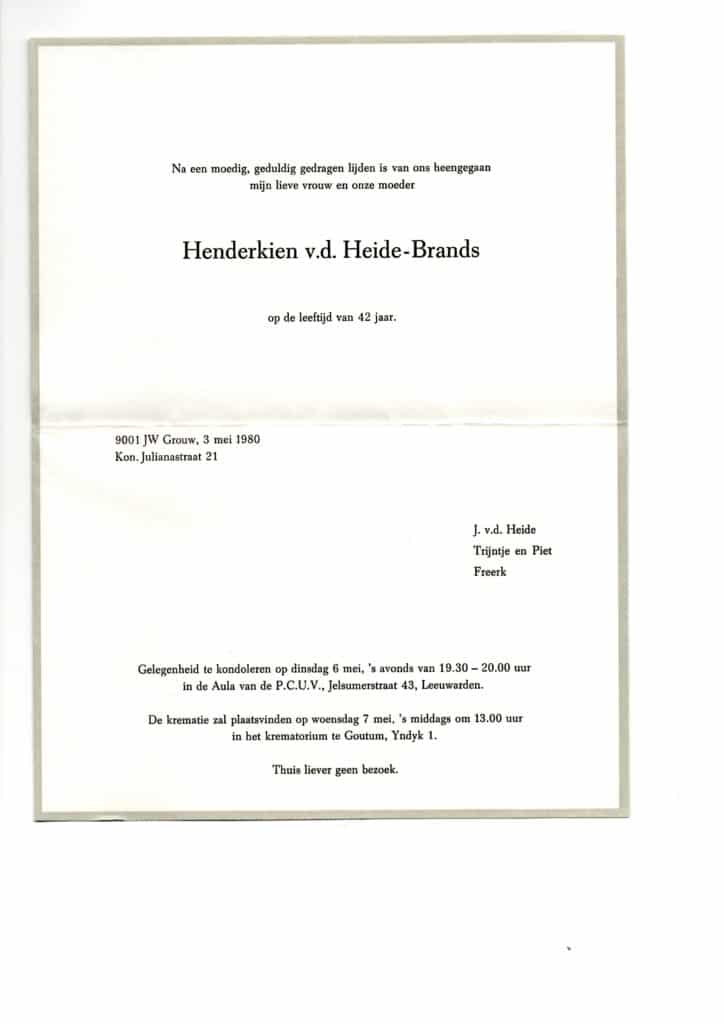 Henderkien v.d. Heide – Brands is overleden in 1980 op 42 jarige leeftijd. Dit zet haar geboortejaar op ongeveer 1938. Helaas is een geboorteplaats niet vermeld.