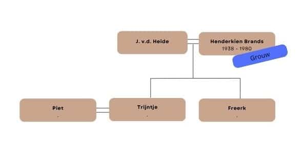 Op basis van de beschrijving “mijn lieve vrouw en onze moeder” ga ik uit van de volgende schets van de gezinssituatie. J. v.d. Heide was de man van Henderkien Brands. Hun dochter Trijntje had een relatie met Piet, hun zoon Freerk had geen relatie.