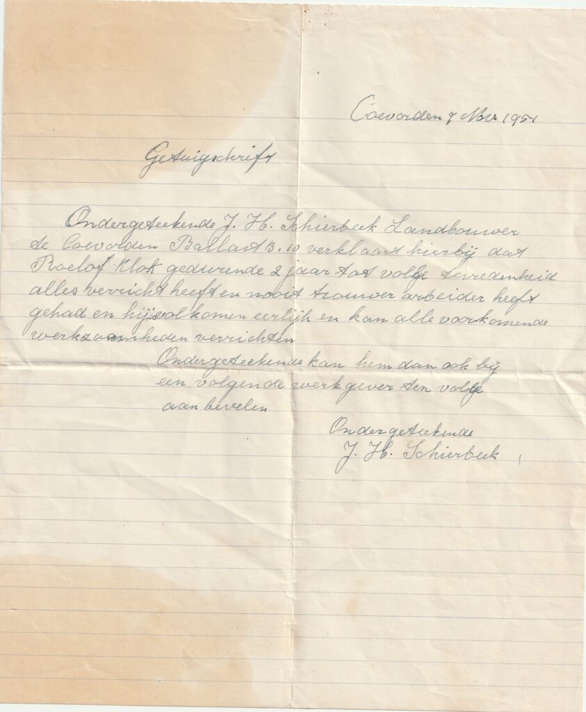 In de briefje getuigd J. H. Schierbeek dat Roelof Klok de trouwste arbeider is geweest die hij heeft gehad. Roelof heeft gedurende 2 jaar voor hem gewerkt in Coevorden.