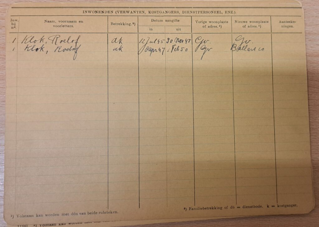 Op de achterzijde van de kaart wordt Roelof Klok (1918-) twee keer vermeld, namelijk van 12 juli 1945 tot 30 november 1945 en van 8 april 1947 tot 1 februari 1950, waarna hij naar Ballast 10 vertrok.