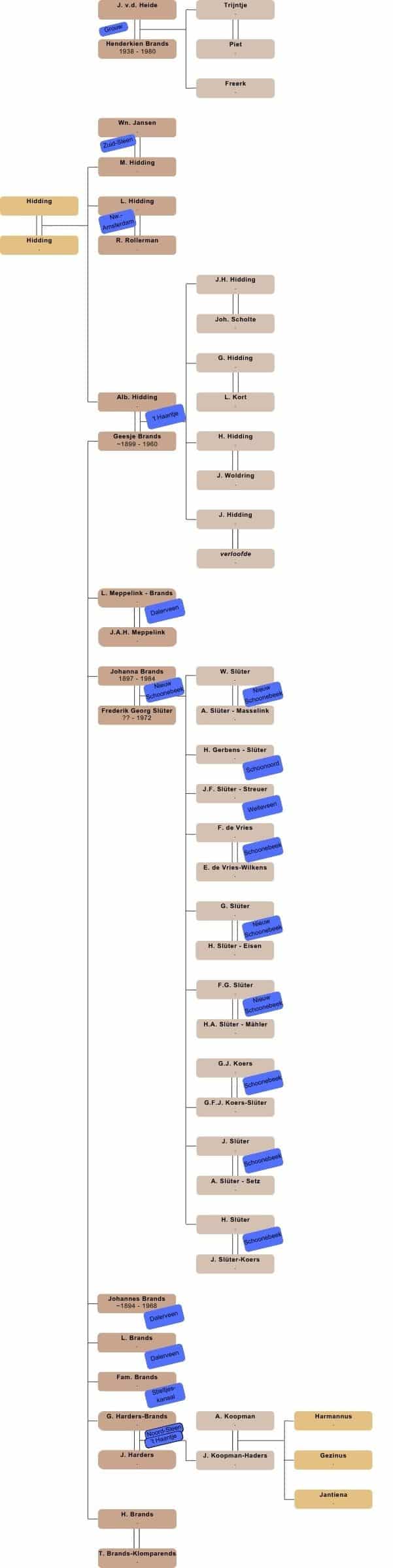 Opvallend is dat we tot nu toe twee keer een familie Brands hebben genoemd in de totale stamboomschets: een gezin uit Dalerveen en een gezin uit Stieltjeskanaal. Op de kaart van Johannes Brands staat een L. Brands uit Dalerveen, waarschijnlijk het eerste gezin. Ik kan echter geen verwijzing terug vinden naar het gezin Brands uit Stieltjeskanaal en geen verwijzing naar Johannes zelf. Daarom heb ik voor nu het gezin uit Dalerveen aangepast naar L. Brands en Johannes extra toegevoegd.