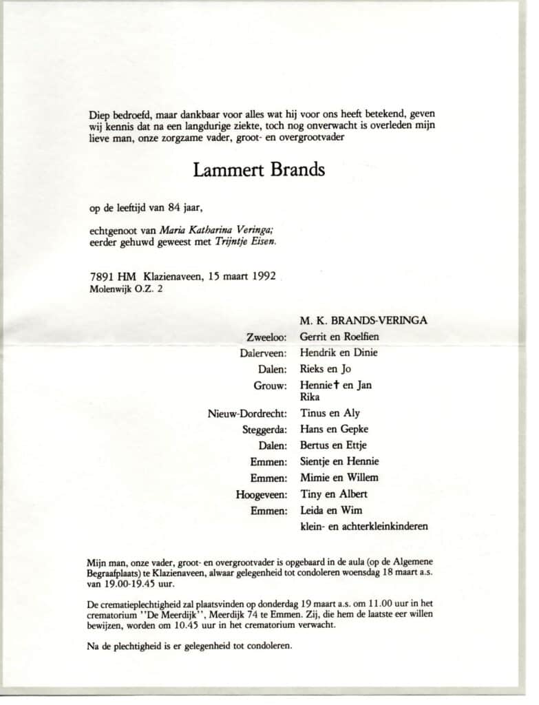 Lammert Brands wordt omschreven als “mijn lieve man, onze zorgzame vader, groot- en overgrootvader“.