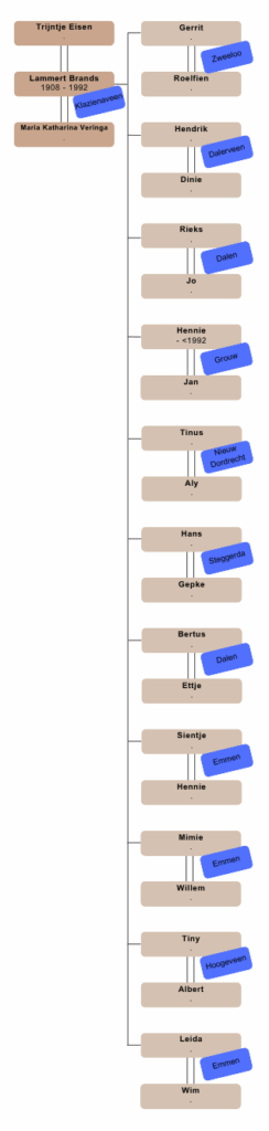 Maar waar hoort dit gezin in de stamboom? Wanneer ik kijk naar de laatste versie, bij de rouwkaart van Johanna Brands, zie ik geen relatie met de vermelde familie. Wel zie ik een mogelijke link met de gegevens van de kaart van Henderkien Brands. Zij is namelijk in 1980 overleden en woonde in Grouw. De naam Henderkien zou afgekort kunnen zijn tot de roepnaam Hennie. Dit wordt bevestigd door de naam Jan, welke aansluit bij de eerste letter van haar mans naam.