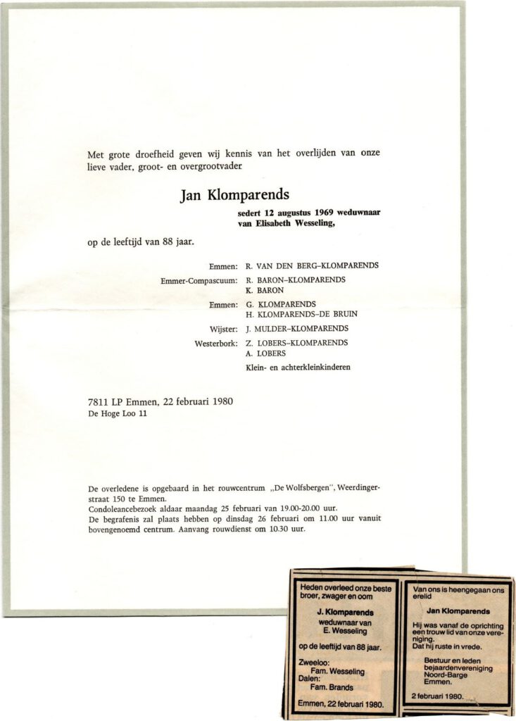 De rouwkaart van Jan Klomparends vermeld dat hij is overleden op 22 februari 1980 op 88-jarige leeftijd. Hij is sedert 12 augustus 1969 weduwnaar van Elisabeth Wesseling.